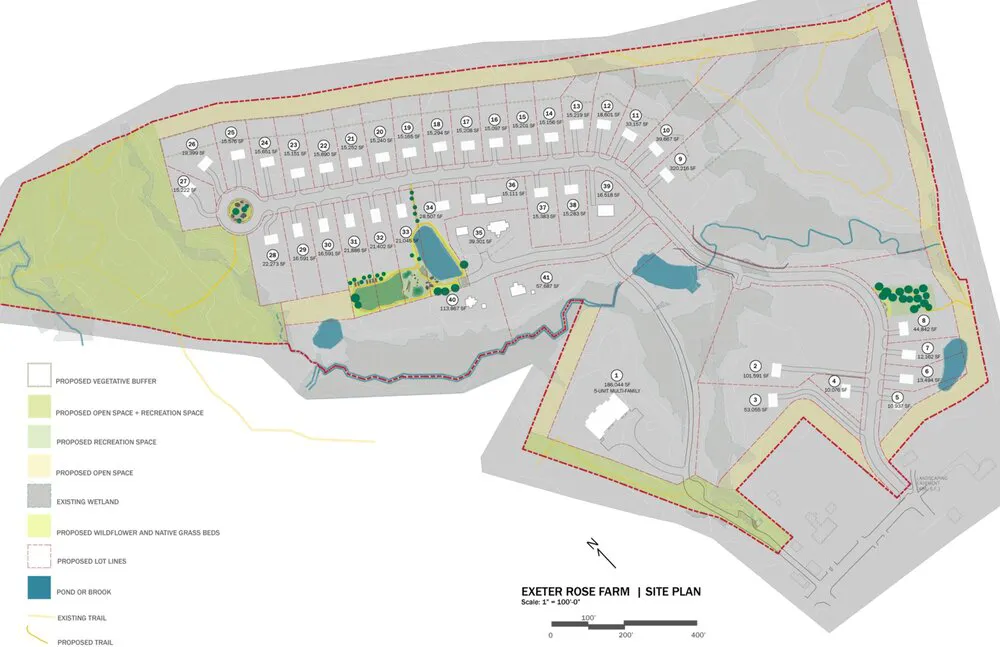 Located just a short walk from downtown Exeter, New Hampshire, Exeter Rose Farm is a lifestyle community that draws on the vibrancy and richness of downtown Exeter while maintaining a serene setting at the edge of the Town Forest’s conservation lands. With innovative neighborhood amenities to serve and unite a diverse community of residents, Exeter Rose Farm is a 44-lot residential community slated to begin construction in 2023. Located on the site of a former nursery used for flower cultivation and adjacent to the Town Forest, Exeter Rose Farm features enduring residences designed to celebrate both family and professional life at a range of sizes and configurations.